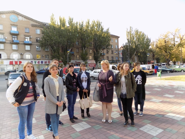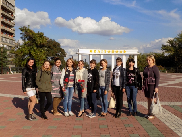 Біля пам’ятника Тарасу Шевченку Шарова Т.М. розповіла студентам про його відкриття, про щорічні мовно-літературні конкурси імені Тараса Шевченка, які проводяться по всій Україні. Було акцентовано на тому, що пам'ятник зроблено в повний зріст. Він був відкритий в Мелітополі 22 травня 2011 року на центральній площі міста. Висота скульптури складає 2,2 метра. Поет зображений у русі, з книгою в руці. Пам'ятник виконаний зі світло-коричневого граніту з Токовського родовища Дніпропетровської області. Скульптура виконана коростишівським майстром Віталієм Рожиком. Постамент пам'ятника облицьований плитами полірованого червоного граніту.