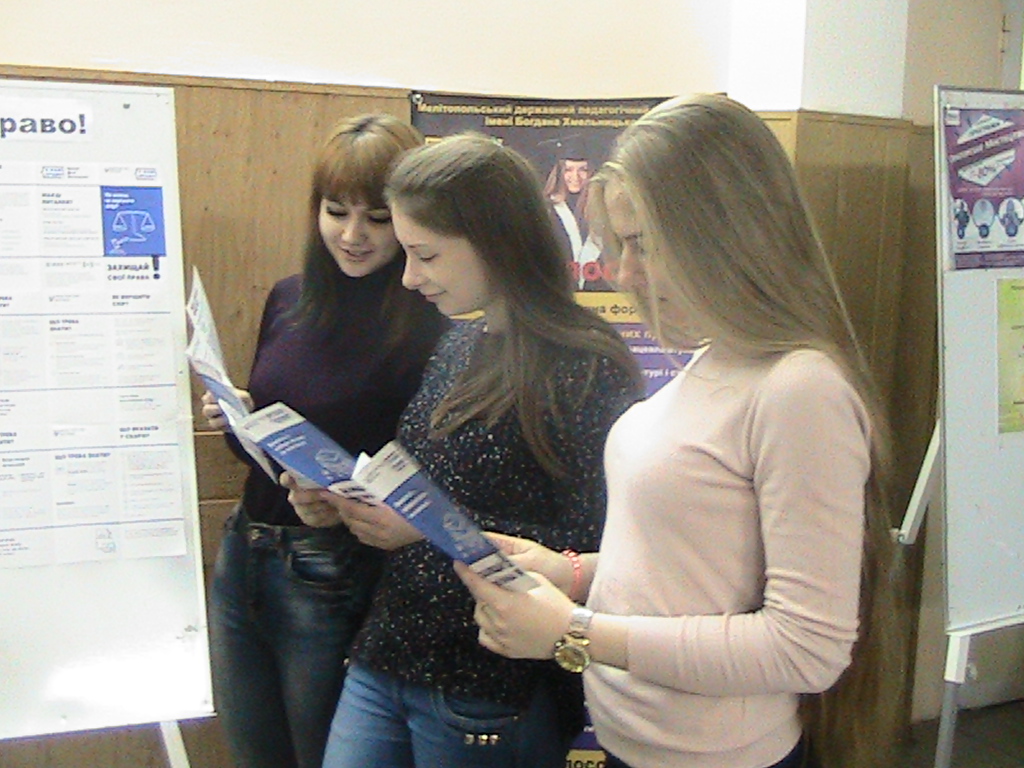 29 листопада 2017 року на факультеті інформатики, математики та економіки Мелітопольського державного педагогічного університету імені Богдана Хмельницького під час проведення заходу працівникам та студентам факультету були надані роз’яснення щодо захисту своїх прав з питань вирішення спорів (трудових, сімейних тощо), реалізації майнових прав, реєстрації та перереєстрації бізнесу. Обговорювались питання відповідальності за неправомірну вигоду, давання та отримання хабара.