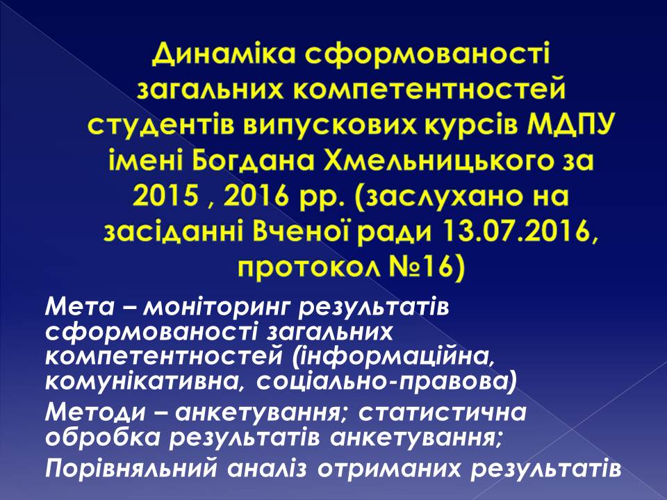 Відповідно рішення розширеного ректорату від 02.06. 2015 з метою реалізації принципу транспарентності, студентноцентрованого і компетентнісного підходів у забезпеченні якості вищої освіти в МДПУ: до 22.06.2015 р. центру профорієнтаційної роботи, кафедрі соціології, постійній комісії із забезпечення якості вищої освіти організувати і провести тренінг для завідувачів випускових кафедр щодо методики визначення і роботи із стейкхолдерами (соціальними партнерами, працедавцями, випускниками) відповідальні – доц. Левада О.М., доц. Афанасьєва Л.В., член комісії – доц. Глєбова Н.І. до 29.06.2015 завідувачам випускових кафедр визначити стратегічних партнерів та розробити реєстр стейкхолдерів – відповідальні завідувачі випускових кафедр (Форма документу з прикладом додається) З метою визначення рівня сформованості загальних компетентностей (як показника якості вищої освіти) у студентів випускних курсів, соціологічній лабораторії і Постійній комісії підготувати на засідання Вченої ради звіт про результати дослідження означеного питання в МДПУ – відповідальні – доц. Афанасьєва, проф.Сегеда Н.А.