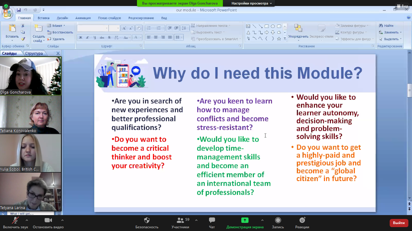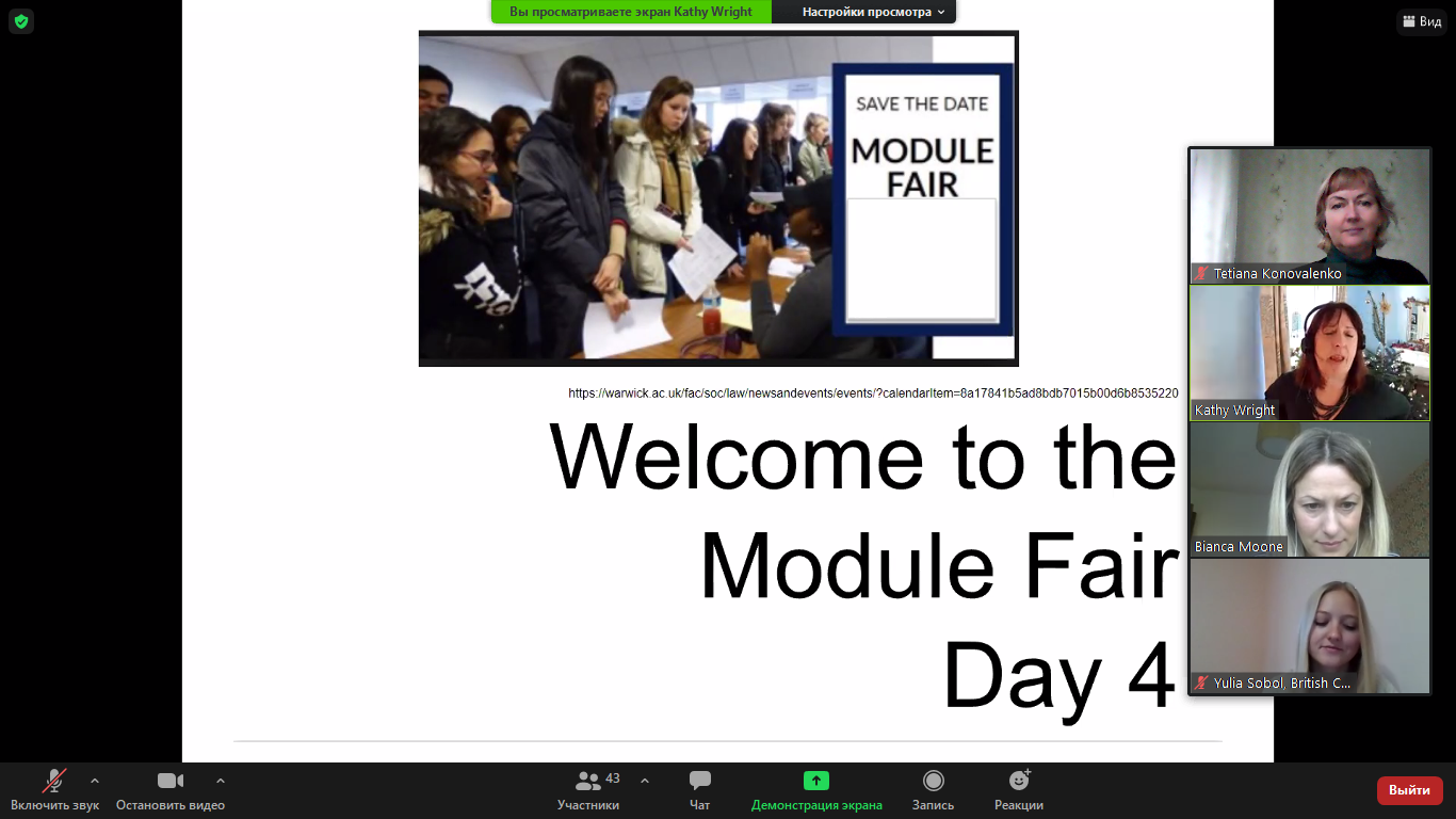 17 грудня 2020 р. відбулись дві останні зустрічі другого етапу, до яких долучились і студентки МДПУ імені Богдана Хмельницького Надія Соломонова та Юлія Кірчева. Їм було запропоновано взяти участь у Ярмарці модулів та оцінити створені групами викладачів з різних вишів міждисциплінарні модулі. Спочатку групи презентували свої модулі усім студентам, а потім відбулась робота в zoom-кімнатах, де студенти спілкувалися почергово з усіма групами-розробниками і дізнавались більш детальну інформацію. Студенти обрали найбільш цікаві модулі та надали фідбек.