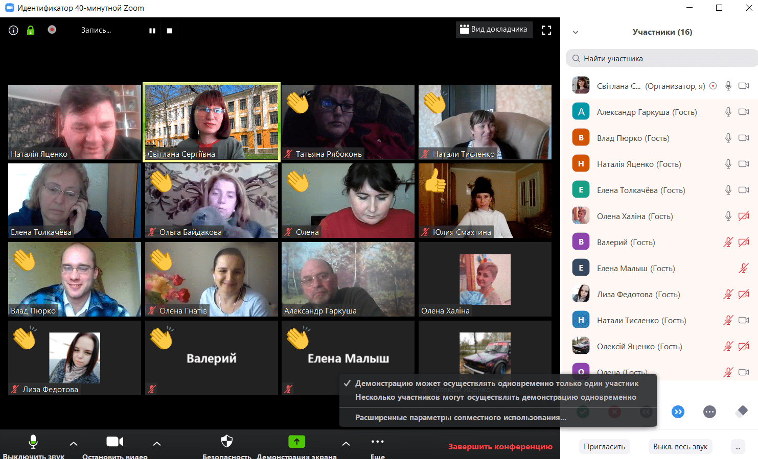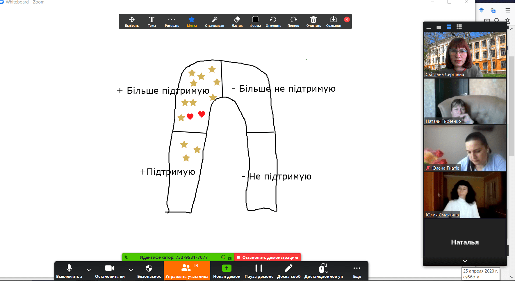 Вправу «Барометр» було проведено на дошці у Zoom, де учасники могли поставити позначки, обираючи на барометрі свою позицію та обґрунтовуючи думку у голосовому чаті.