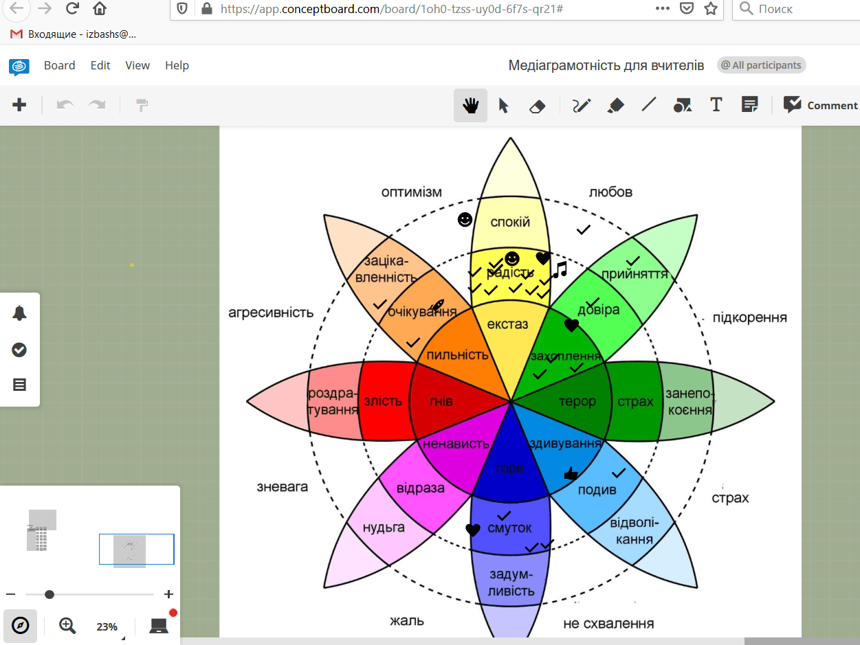 Для розуміння впливу медіа через емоції, застосовано гру «Квітка емоцій» за методикою IREX. Виконати дану вправу слухачам запропоновано за допомогою платформи https://app.conceptboard.com, де кожен учасник міг під час оголошення новини з інтернету поставити позначку біля тієї емоції, яку він відчуває коли читає новину.