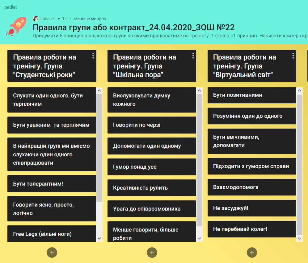 Очікування учасників, правила групи, контракт та парковку розмістили на онлайн-дошці https://padlet.com та разом створили принципи комфортних умов роботи на онлайн-тренінгу.