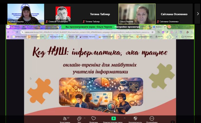 🛠🌐 Практична частина тренінгу була побудована на матеріалах презентації спікерки та включала ознайомлення з цифровими освітніми сервісами Claude, Interacty, Cyberkids Ukraine, Conker, Padlet. Учасники опрацювали приклади їх використання для створення інтерактивних завдань, проєктної діяльності та організації сучасного уроку інформатики.