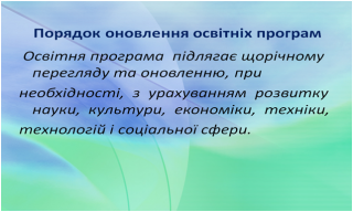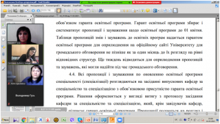 Було актуалізовано інформацію щодо: порядку оновлення ОП, підстав для перегляду освітньої програми, термінів та особливостей підготовки пакету документів для затвердження змін до ОП на Вченій раді університету.
