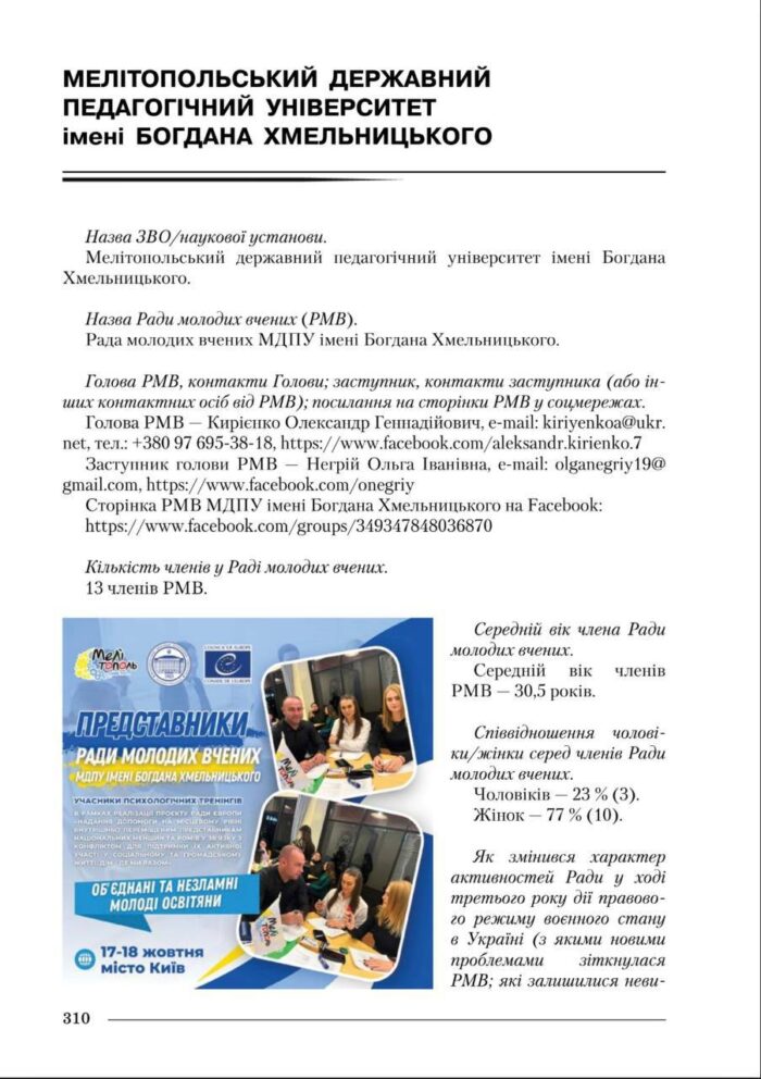 ✅👩🏼🏫 У новому виданні 22 сторінки присвячені діяльності Ради молодих вчених МДПУ імені Богдана Хмельницького. Тут представлено не лише досвід організації роботи в умовах релокації, а й активну участь молодих вчених у проєктній діяльності, міжнародних заходах, наукових дискусіях та ініціативах, що просувають бренд Університету на всеукраїнському й міжнародному рівнях.