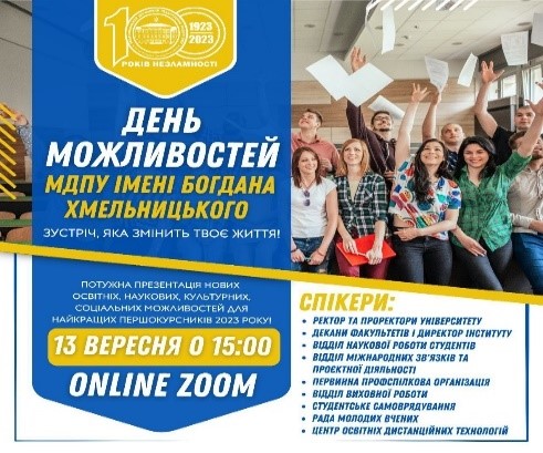– освітньо-просвітницький meet up «День можливостей МДПУ імені Богдана Хмельницького», у межах якого відбулось знайомство першокурсників з керівництвом Університету, навчально-наукового інституту та факультетів, презентовано напрями діяльності різних структурних підрозділів та встановлено нові корисні контакти;
