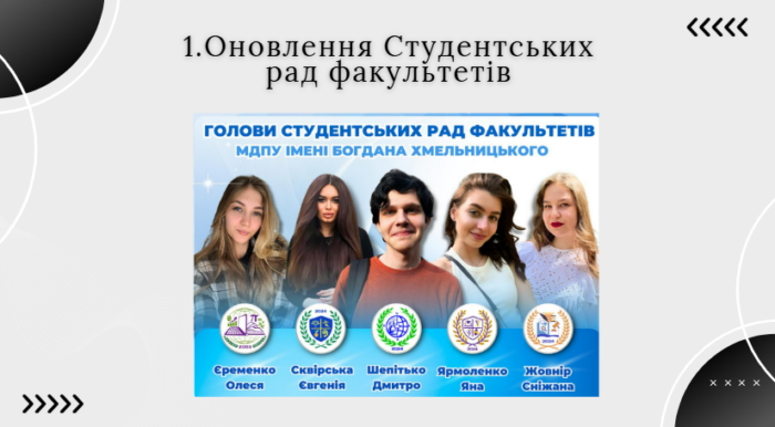 Органи студентського самоврядування, які є важливими структурними підрозділами в Університеті, беруть активну участь у забезпеченні якості вищої освіти, волонтерській діяльності, представляють МДПУ імені Богдана Хмельницького на всеукраїнському та міжнародному рівнях. У зв’язку з реорганізацією структурних підрозділів університету було проведено значну модернізацію роботи студентського самоврядування. Зокрема, оновлено склад студентських рад факультетів, обрано нових голів та сформовано ефективні факультетські студентські команди. Це оновлення спрямоване на покращення координації, збільшення активності здобувачів вищої освіти та залучення їх до розвитку університету. Для підвищення ефективності комунікації зі студентами впроваджено низку нових інструментів, зокрема: