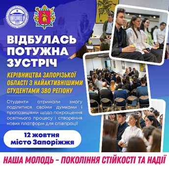 Представники студентської ради брали участь у зустрічах із Міністром освіти і науки України Оксеном Лісовим (жовтень 2024 р.), Головою Запорізької обласної військової державної адміністрації Іваном Федоровим (жовтень 2024 р.), Президентом України Володимиром Зеленським (листопад 2024 р.), Уповноваженим Верховної Ради України з прав людини Дмитром Лубінцем (грудень 2024 р.).