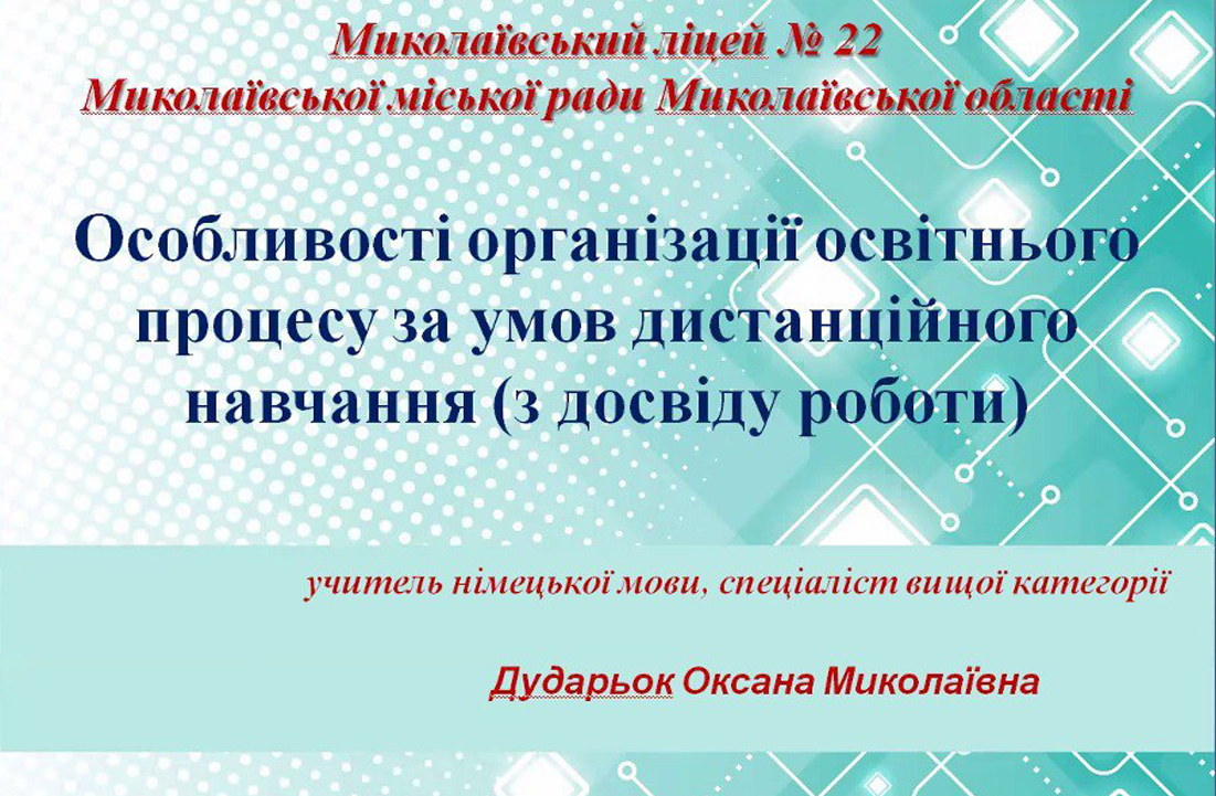 23 березня на філологічному факультеті на платформі Zoom відбулася зустріч здобувачів вищої освіти із Дударьок Оксаною Миколаївною, учителем німецької мови, спеціалістом вищої категорії Миколаївського ліцею №22 Миколаївської міської ради Миколаївської області на тему «Особливості організації освітнього процесу за умов дистанційного навчання (з досвіду роботи)».
