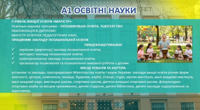 🔹 Спеціальність А1 «Освітні науки» (Педагогіка вищої школи та Позашкільна освіта. Тьюторство) — можливості для майбутніх тьюторів, наставників і викладачів закладів вищої освіти, які прагнуть розвивати сучасну позашкільну освіту та працювати у сфері вищої школи.
