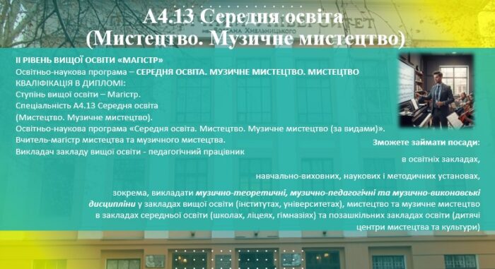 🔹 Спеціальність А4.13 «Середня освіта. Мистецтво. Музичне мистецтво» — підготовка вчителів музичного мистецтва, які поєднують педагогічну майстерність із творчим самовираженням та розвитком молодіжних талантів.