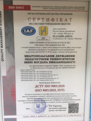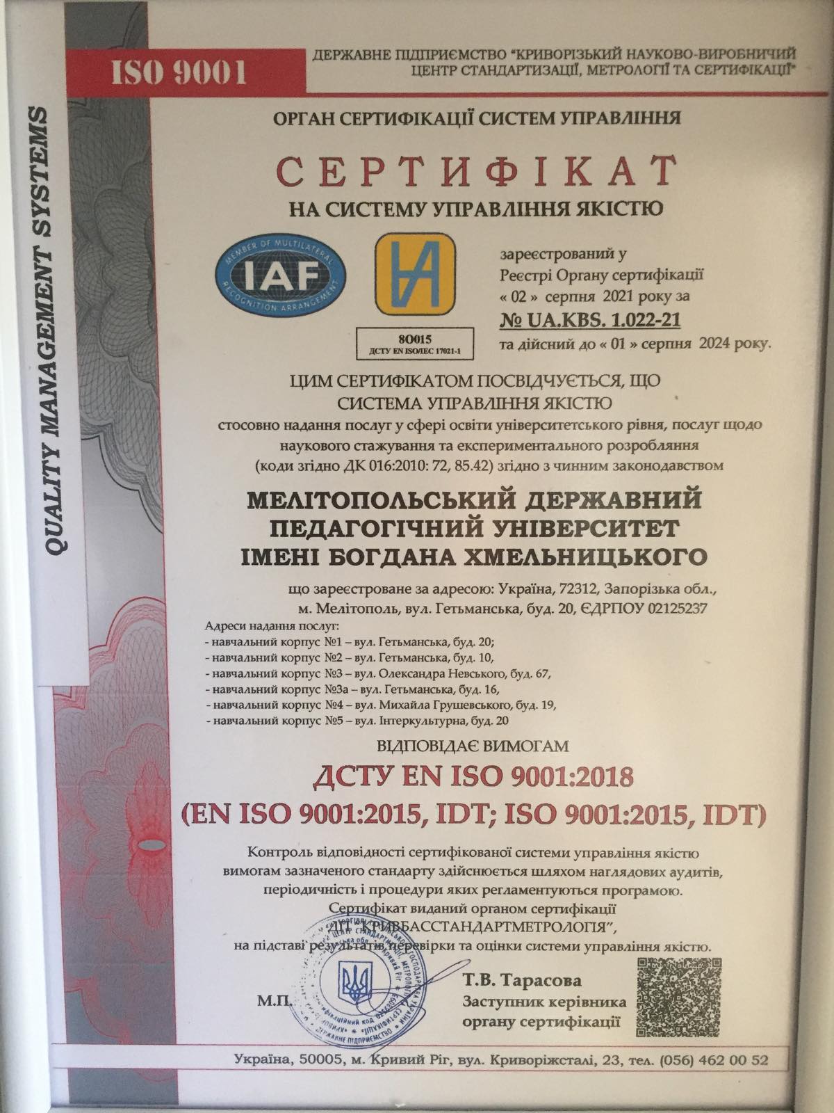 Система внутрішнього забезпечення якості вищої освіти Мелітопольського державного педагогічного університету імені Богдана Хмельницького базується на основі вимог Закону України «Про вищу освіту», «Про освіту» та Стандартів і рекомендацій забезпечення якості у європейському просторі вищої освіти у відповідності до вимог ДСТУ ISO 9001:2015 (ISO 9001:2015, IDT), ДСТУ EN ISO 9001:2018 (EN ISO 9001:2015, IDT ISO 9001:2015, IDT).