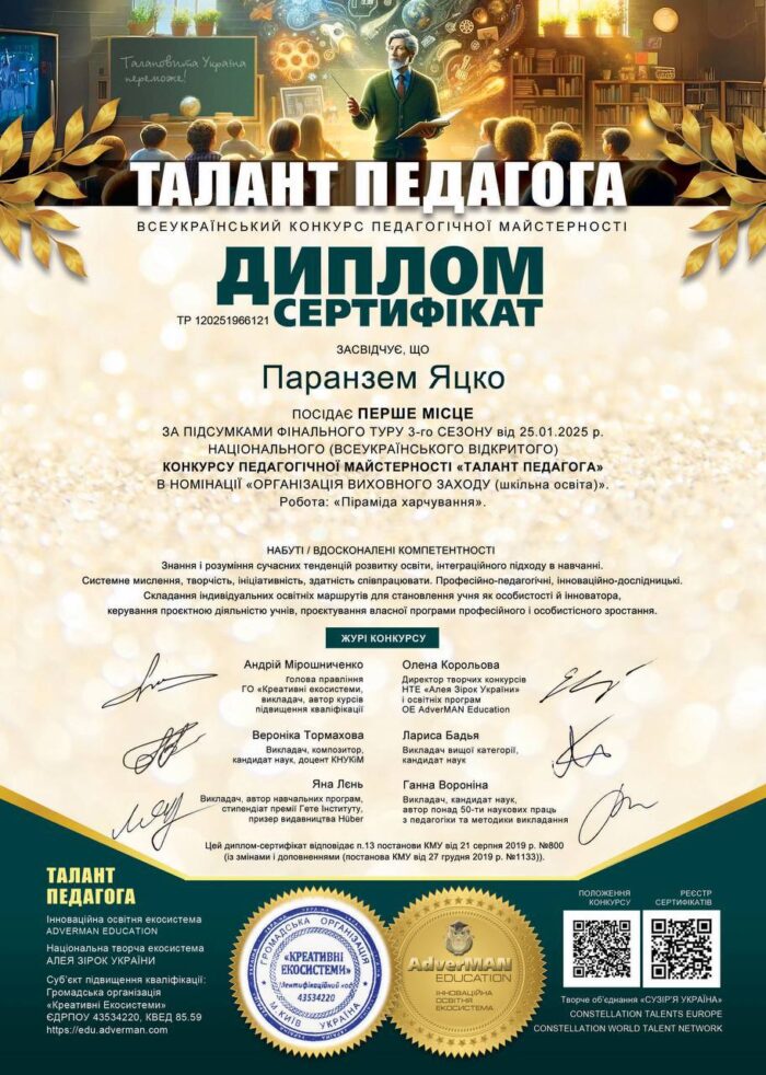 🇺🇦🏆З гордістю повідомляємо, що ПЕРШЕ МІСЦЕ в номінації «Організація виховного заходу (шкільна освіта)» з роботою «Піраміда харчування» посіла ПАРАНЗЕМ АВАЗІВНА ЯЦКО – здобувачка вищої освіти ІІ (магістерського) рівня за спеціальністю 014.05 Середня освіта (Біологія та здоров’я людини), освітньо-професійна програма «Середня освіта. Біологія та здоров’я людини. Психологія», а також креативний і відданий своїй справі вчитель Одеського Ліцею № 24 Одеської Міської Ради!