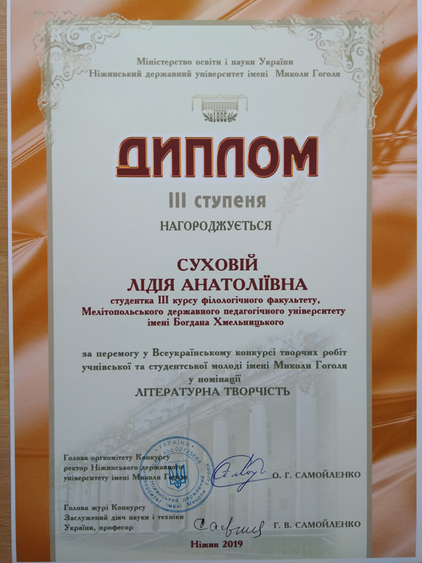 - Суховій Лідія Анатоліївна, студентка ІІІ курсу (науковий керівник доцент Шаров С.В.) – номінація ЛІТЕРАТУРНА ТВОРЧІСТЬ (власні прозові, поетичні твори та переклади творів Гоголя)