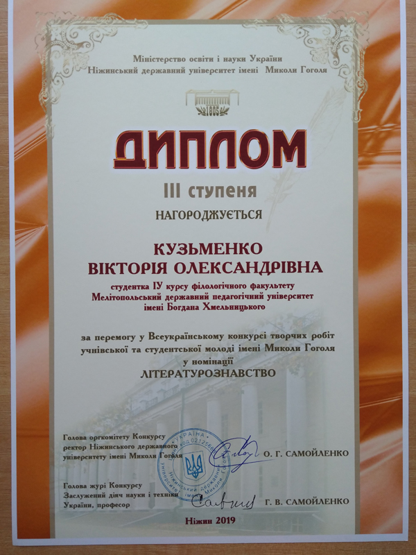 За рішенням Журі Всеукраїнського конкурсу дві студентки філологічного факультету Мелітопольського державного педагогічного університету імені Богдана Хмельницького отримали перемогу (дипломи ІІІ ступеня):