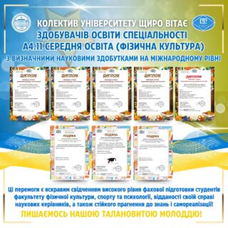 🏆🌸 І місце у Міжнародній вікторині «Світ знань» (номінація «Фізичне виховання»), науковий керівник – доктор біологічних наук, професор, завідувач кафедри теорії та методики фізичного виховання Христова Т.Є.