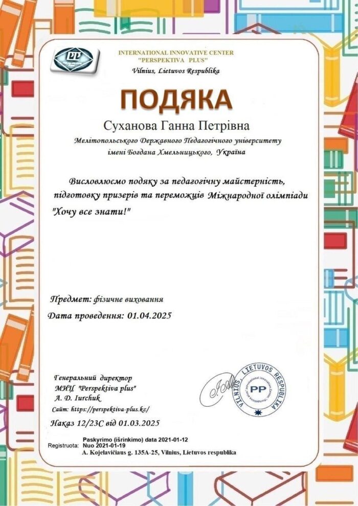 🏆🌸 І місце у Міжнародній олімпіаді «Хочу все знати» (номінація «Фізичне виховання»), керівник – старший викладач кафедри теорії та методики фізичного виховання Суханова Г.П.