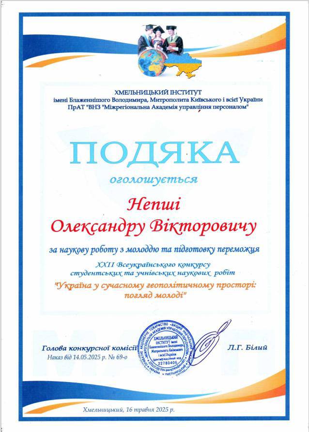 👏🏻👨🏼🎓Окрема щира подяка науковому керівнику — старшому викладачу кафедри географії та туризму Непші Олександру Вікторовичу за неоціненну наукову підтримку, системну роботу з молоддю, натхнення, наставництво та підготовку переможця!