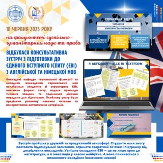 📚✅ 18 червня 2025 року на факультеті суспільно-гуманітарних наук та права відбулася консультативна зустріч з підготовки до Єдиного вступного іспиту (ЄВІ) з англійської та німецької мов. Захід став важливим етапом підтримки здобувачів, які планують вступ до магістратури.