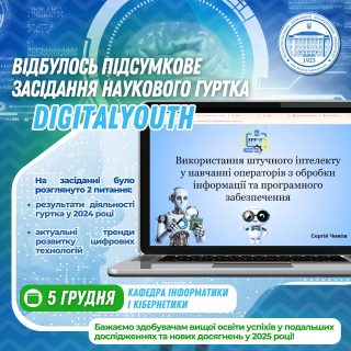 📅💫 05 грудня 2024 року відбулося підсумкове засідання наукового гуртка кафедри інформатики і кібернетики DigitalYouth (керівник — д.пед.н., проф. Круглик В.С.).
