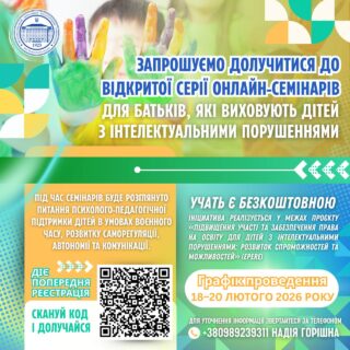 👨👩👧👦 Шановні батьки! Запрошуємо вас долучитися до відкритої серії онлайн-семінарів для родин, які виховують дітей з інтелектуальними порушеннями. Захід відбудеться 18–20 лютого 2026 року в межах міжнародного проєкту EPERE.