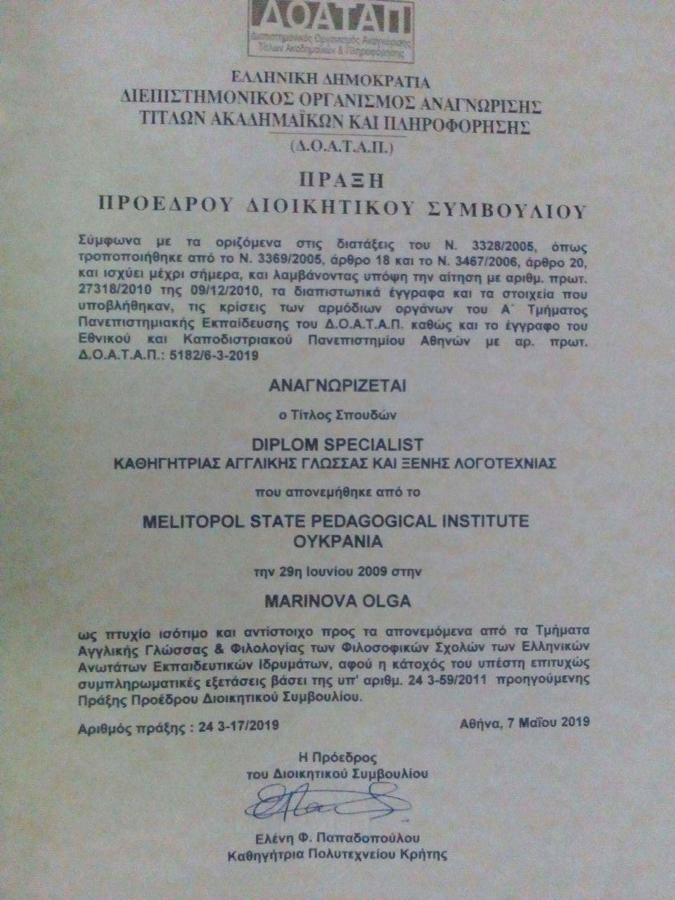 Загальновідомим є той факт, що для випускників філологічного факультету МДПУ імені Богдана Хмельницького відкритим є весь світ. Ще одним яскравим підтвердженням цього є професійний успіх Ольги Марінової (Костенко), яка в 2000-х роках вивчала античну літературу, давньогрецьку мову і не підозрювала, що житиме на Батьківщині Гомера, неподалік від свяченої гори Парнасос із розташованими на ній Дельфами. У цьому році вона закінчила навчання на філософському факультеті Національного університету в м. Афіни (Греція) – National Kapodistrian University of Athens. Ольга склала іспити з «Американського модернізму», «Американського романтизму», «Вікторіанського періоду в Англійській літературі» та з «Сучасної літератури Англії». Підтвердивши свої знання на письмових іспитах, отримала такі ж права, як і випускники університету, які є громадянами Греції. Зараз Ольга Марінова згідно з дипломом, виданим в МДПУ імені Богдана Хмельницького, та дипломом грецького вишу має право працювати в школах, приватних коледжах та інститутах підвищення кваліфікації. Проте Ольга не збирається зупинятись у своїх здобутках – найближчим часом планує скласти іспит з історії Греції та отримати ширші можливості щодо працевлаштування.