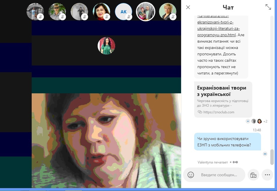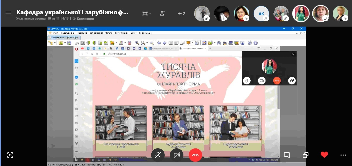 Доповідач, доцент Землянська А.В., ознайомила із основними видами електронних засобів навчання (електронних підручників, онлайн-платформ, інтерактивних плакатів тощо), використання яких стало над актуальним в умовах дистанційної освіти, та методикою роботи з ними на заняттях з літератури в напрямку формування громадянської компетентності.