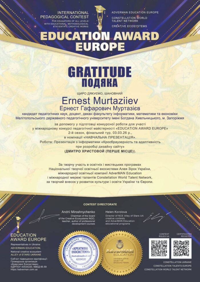 🔹 Муртазієву Ернесту Гафаровичу — за професійний супровід, експертність і підтримку у сфері математики і цифрових технологій;