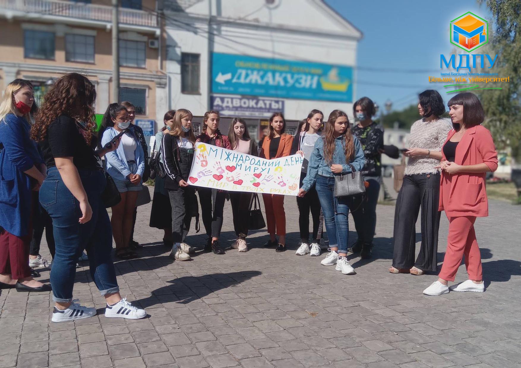 Студенти філологічного факультету долучилися до святкування цього дня й провели акцію «Прагнемо неба, де літають голуби». В умовах пандемії, коли не можна збирати велику кількість людей у приміщеннях, студенти першого курсу 210-ф та 310-ф груп відобразили загальні прагнення миру у стіннівці, під якою зібрали підписи всіх охочих підтримати мирні настрої.