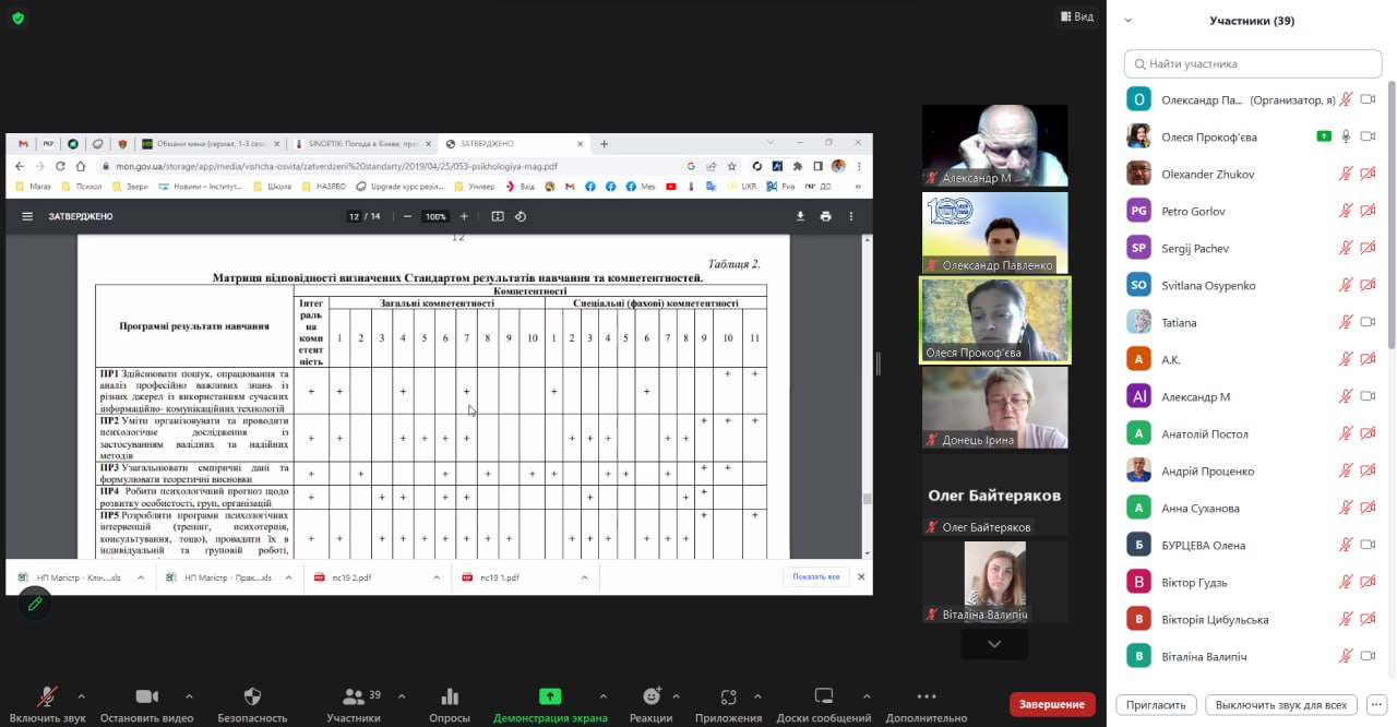 Керівник Центру експертизи та моніторингу якості освітнього процесу Прокоф’єва О.О. акцентувала увагу гарантів на Матриці відповідності визначених Стандартом результатів навчання та компетентностей та рекомендувала їх використовувати при оновленні освітніх програм, зокрема при укладенні Матриці відповідності програмних компетентностей компонентам освітньої програми та Матриці забезпечення програмних результатів навчання відповідними компонентами освітньої програми.