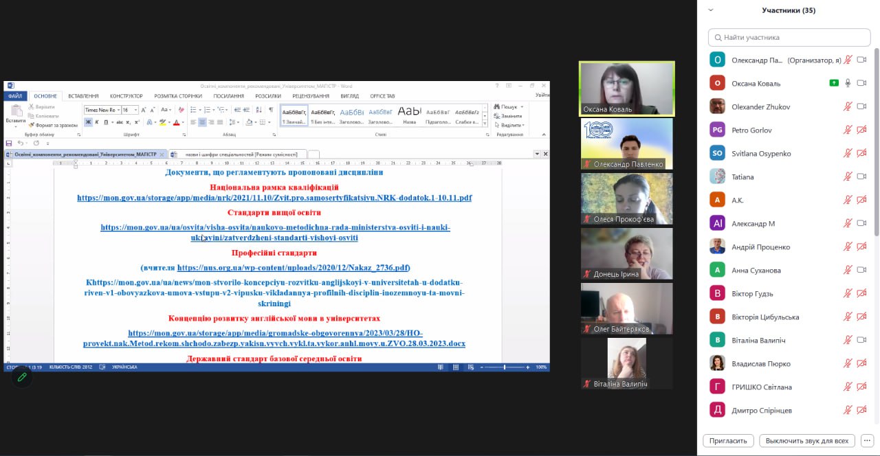 Начальник навчального відділу Котенко О.В. ознайомила гарантів освітніх програм з документацією МОН України (зокрема, Національною рамкою кваліфікацій, оновленими стандартами вищої освіти і професійними стандартами, Концепцією розвитку англійської мови в університетах, проєктом Стандарту вищої освіти зі спеціальності 014 «Середня освіта» на першому бакалаврському) рівні вищої освіти) та пояснила механізм оновлення освітніх програм з врахуванням зазначеної документації.