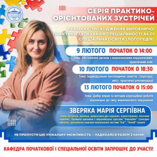 кафедра початкової і спеціальної освіти запрошує здобувачів спеціальності А6.01 Спеціальна освіта (Логопедія) на серію практико-орієнтованих зустрічей з логопедом-практиком.