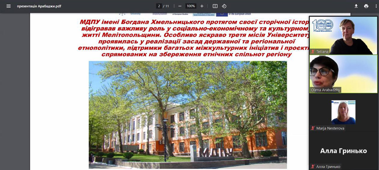 1 листопада проректор з науково-педагогічної роботи, зовнішніх зв’язків і стратегічного розвитку Олена Арабаджи презентувала досвід МДПУ імені Богдана Хмельницького щодо реалізації третьої місії Університету. У онлайн-доповіді пані Олена підкреслила, що протягом сторічної історії Університет відігравав важливу роль у розвитку й становленні громадянського суспільства, соціальному та культурному житті Мелітопольщини, активно співпрацював з міською владою, громадськими організаціями, бізнес-структурами та різноманітними соціальними інституціями. Особливо яскраво соціальна місія Університету проявилась у реалізації засад державної та регіональної етнополітики, підтримки багатьох міжкультурних ініціатив і проєктів, спрямованих на розвиток і самовираження етнічних спільнот Мелітополя.