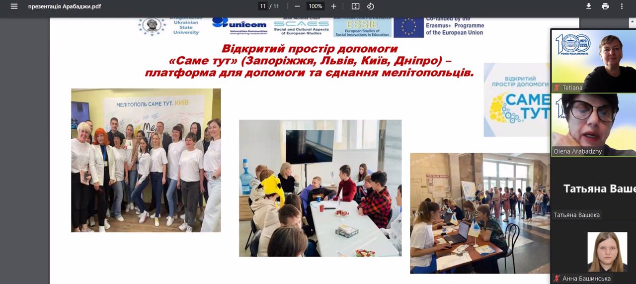 З початком повномасштабної війни Університет продовжує свою соціальну місію – посилена взаємодія з Міністерством з питань реінтеграції тимчасово окупованих територій України, Запорізькою обласною воєнною адміністрацією; проводиться активна волонтерська робота та психологічна підтримка учасників війни та ВПО. Різноманітною є участь викладачів та здобувачів освіти у роботі Центрів відкритого простору допомоги «Саме тут» у Запоріжжі, Києві, Львові, Дніпрі. МДПУ імені Богдана Хмельницького є активним партнером Мелітопольської міської ради у соціальних та культурних проектах, учасником розробки Дорожньої карти реінтеграції та повоєнного відновлення Мелітопольщини тощо. Дякуємо за увагу до досвіду МДПУ імені Богдана Хмельницькогоо та участь викладачів Університету в обговоренні презентації.
