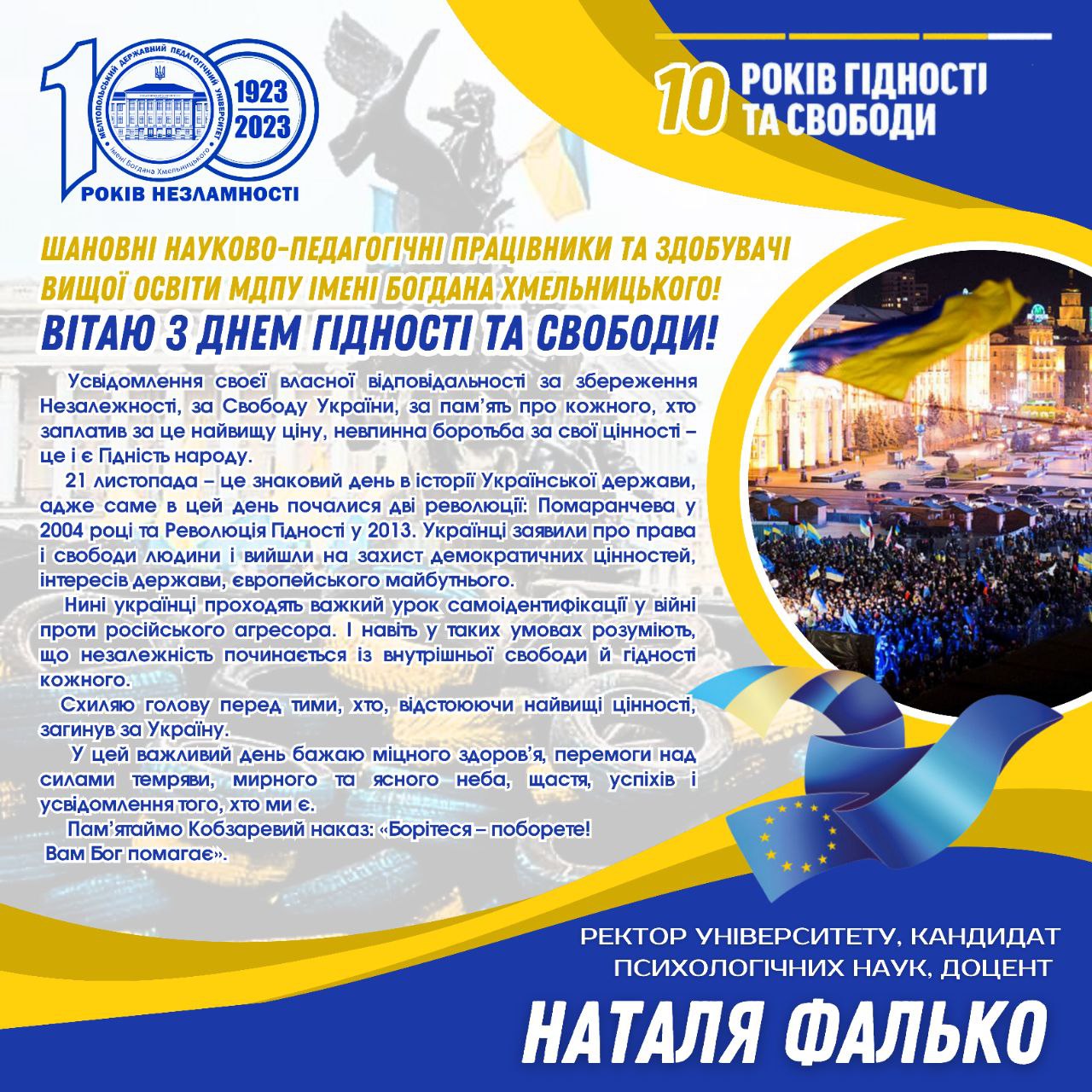 Привітання ректора Мелітопольського державного педагогічного університету імені Богдана Хмельницького, кандидата психологічних наук, доцента Наталі ФАЛЬКО з нагоди Дня Гідності та Свободи