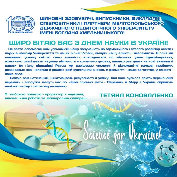 Привітання з Днем науки в Україні проректора з наукової, інноваційної роботи та міжнародної співпраці Мелітопольського державного педагогічного університету імені Богдана Хмельницького Тетяни Коноваленко