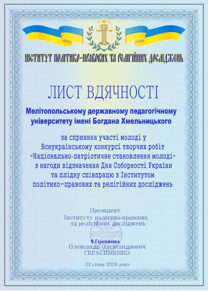 👏🏻👥 Незламна родина МДПУ імені Богдана Хмельницького продовжує вітати своїх здобувачів освіти й випускників, які гідно представили університет на Всеукраїнському конкурсі творчих робіт «Національно-патріотичне становлення молоді», приуроченому до відзначення Дня Соборності України.