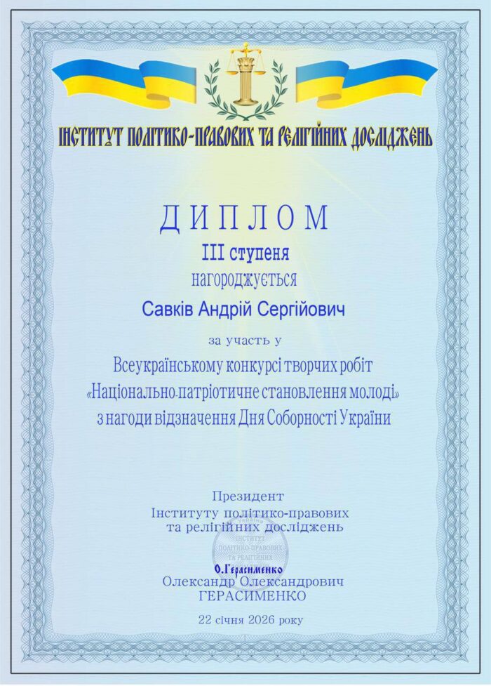 🥉‼️ Дипломом ІІІ ступеня нагороджено Савківа Андрія, здобувача спеціальності 051 Економіка, за участь у конкурсі та представлення конкурсної творчої роботи на тему «Патріотизм як щоденна дисципліна: чому війна вчить молодь».