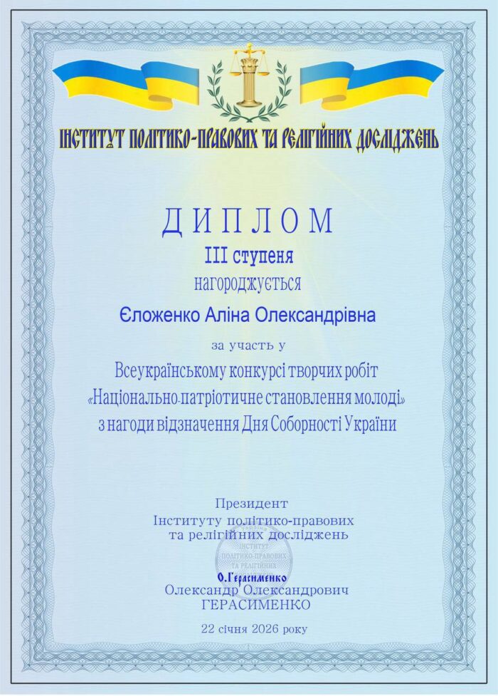 🥉‼️ Дипломом ІІІ ступеня також відзначено Єложенко Аліну, випускницю спеціальності 014.01 Середня освіта. Українська мова та література. Англійська мова та зарубіжна література, за участь у конкурсі та представлення конкурсної творчої роботи на тему: «Символи незламної свободи України».