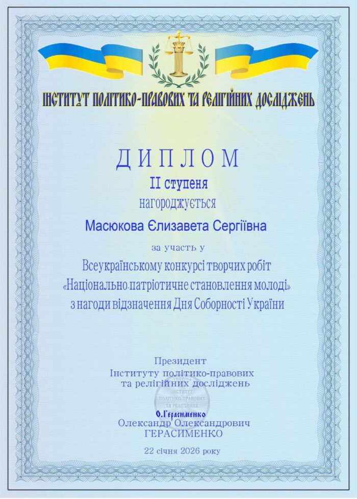 🥈‼️Дипломом ІІ ступеня нагороджено Масюкову Єлизавету, здобувачку освіти ІІ (магістерського) рівня спеціальності 035.041 Філологія. Германські мови та літератури (переклад включно), перша — англійська, за участь у конкурсі та представлення конкурсної творчої роботи на тему «Національна єдність-сила України».