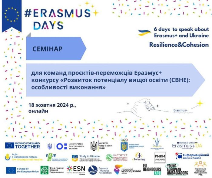 18 жовтня проректор з наукової, інноваційної роботи та міжнародної співпраці МДПУ імені Богдана Хмельницького Лариса Полякова взяла участь у семінарі для команд проєктів-переможців Еразмус+ конкурсу «Розвиток потенціалу вищої освіти (CBHE): особливості виконання», який був проведений в межах Всеукраїнських #ErasmusDays 2024.