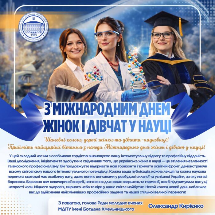 МДПУ > Новини університету > Привітання голови Ради молодих вчених Мелітопольського державного педагогічного університету імені Богдана Хмельницького Кирієнко Олександра з Міжнародним днем жінок і дівчат у науці!
