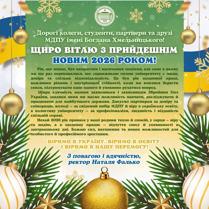 МДПУ > Новини університету > Привітання ректора МДПУ, професора Наталі Фалько з прийдешнім Новим 2026 Роком!