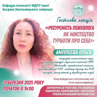 👩🏼🎓💫 Лектор: Амплєєва Ольга Михайлівна – кандидат психологічних наук, доцент кафедри соціальної психології ОНУ ім. І.І. Мечникова, практичний психолог, сертифікований НЛП-Майстер Тренер та НЛП Експерт, консультант з травмуючих подій.