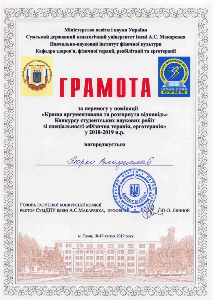 За результатами проведення підсумкової науково-практичної конференції конкурсу Пюрко Владислава (переможця попереднього року) нагороджено Грамотою за перемогу в номінації «Краща аргументована та розгорнута відповідь».
