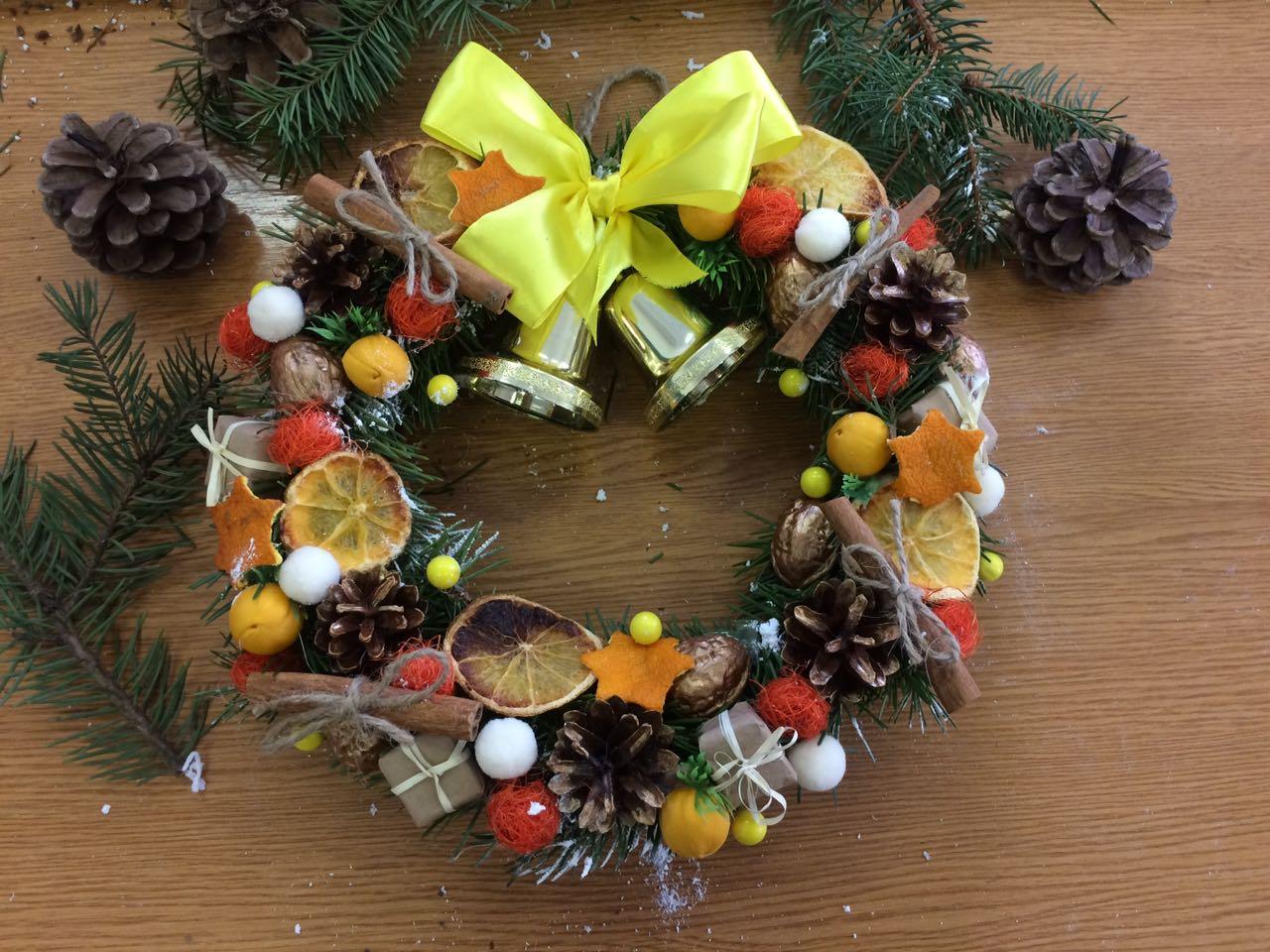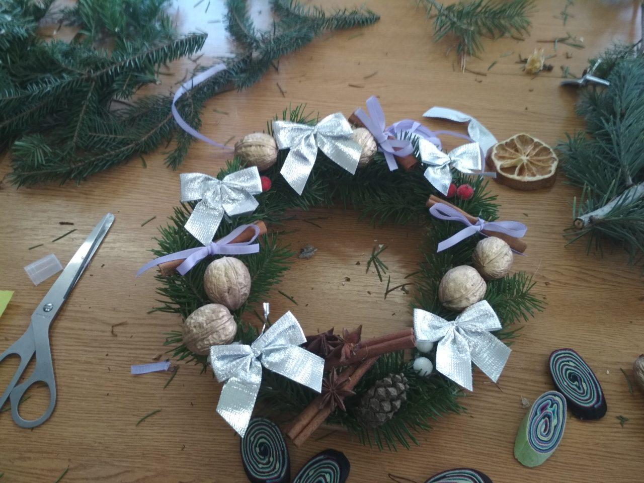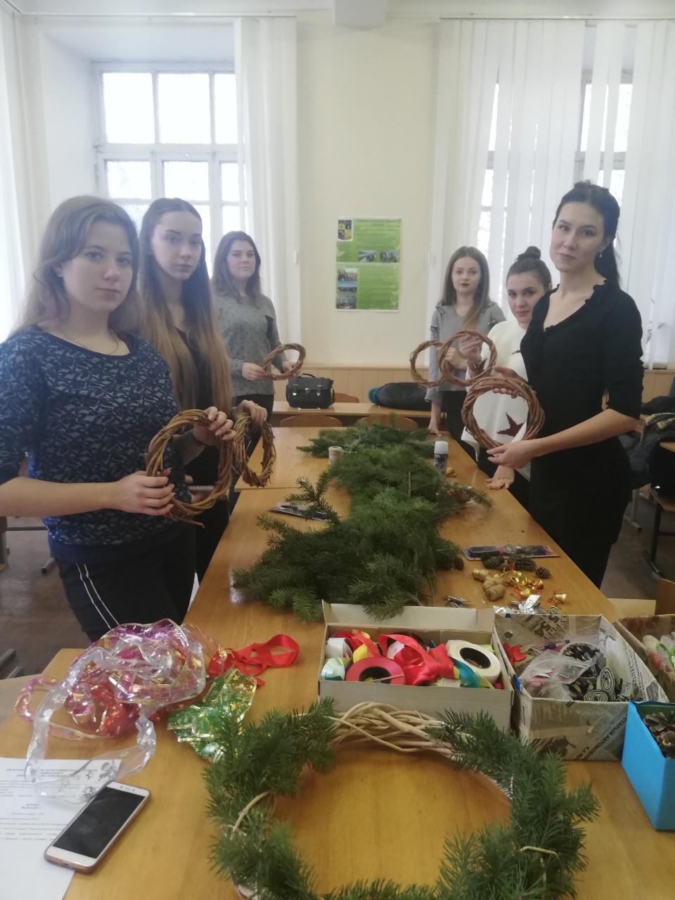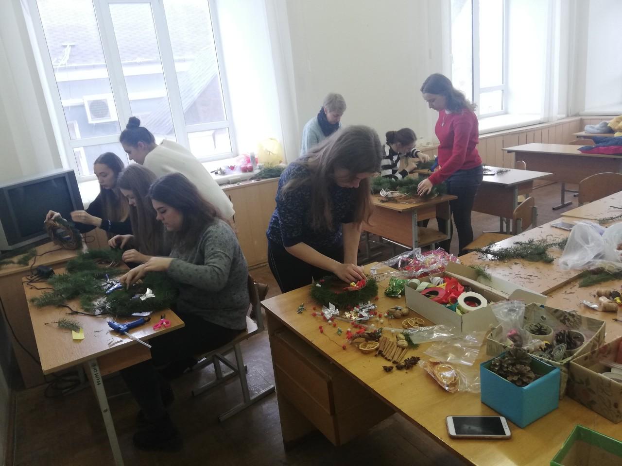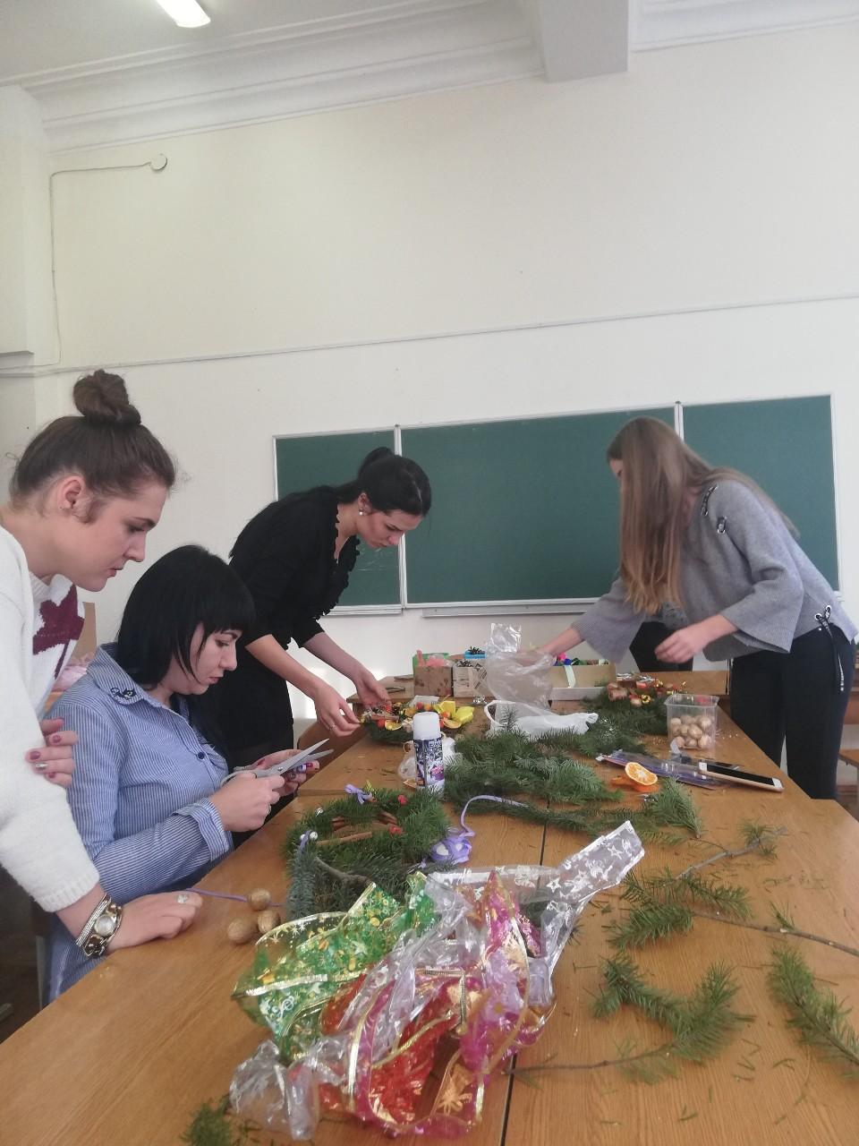 У ході практичної частини заходу дівчата під керівництвом професійного флориста Коваленко Д.В. створювали власний різдвяний вінок: вчилися працювати з клейовим пістолетом і декоративними матеріалами, запам’ятовували дизайнерські секрети, придумували композицію і комбінували кольори.