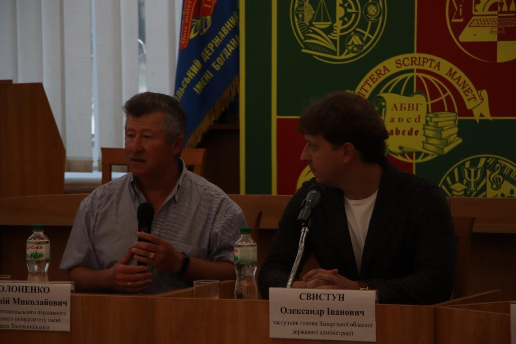 Наприкінці робочого візиту відбулася зустріч заступника голови Запорізької обласної державної адміністрації Олександра Свистуна та заступника начальника Департаменту освіти і науки Запорізької обласної державної адміністрації Олени Сороченко з науково-педагогічними працівниками університету. Пан Олександр проінформував колектив про напрямки соціальної роботи в Запорізькій області, особливості регіонального замовлення для вступників тощо. Колектив університету отримав високу оцінку своєї освітньої та наукової діяльності.
