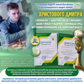 🥇 Вагомого результату досяг Дмитро Христовой — здобувач вищої освіти факультету інформатики, математики та економіки за спеціальністю 015.39 «Професійна освіта (Цифрові технології)», який представляв збірну Мелітопольської громади. Завдяки узгодженій командній взаємодії та високому рівню індивідуальної підготовки команда посіла перше місце, здобувши почесний кубок і відзнаки у вигляді грамот і медалей.