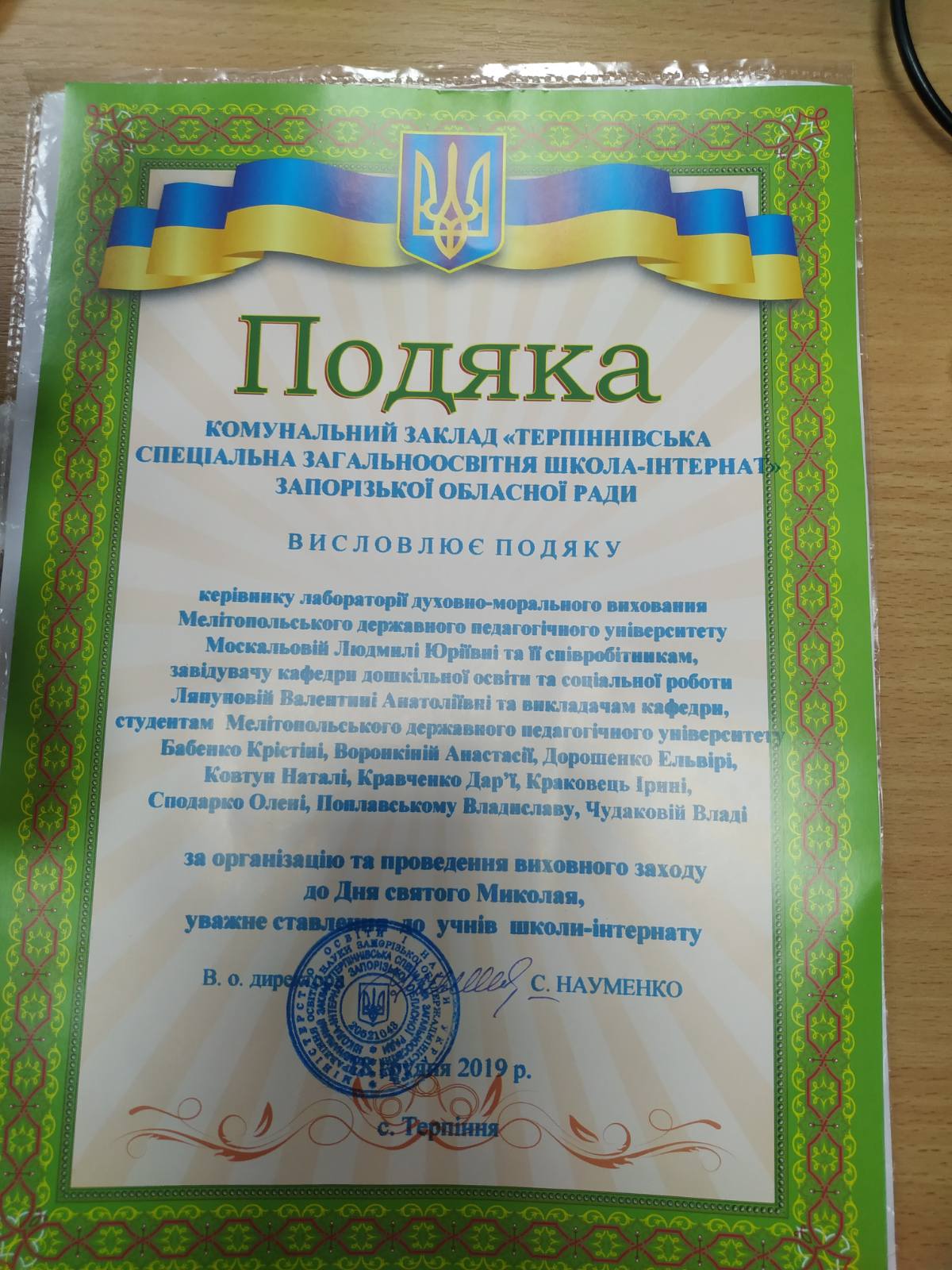 Усе це мали змогу оцінити вихованці Терпіннівської спеціальної загальноосвітньої школи-інтернату вже 18 грудня 2019 р. куди завітали викладачі і студенти якраз напередодні улюбленого свята. Дівчатка і хлопчики із захопленням переглядали виставу, приймали участь в конкурсних змаганнях, танцях та співах. Усі разом, і студенти, і діти отримали позитивний заряд та творче натхнення від такої зустрічі.